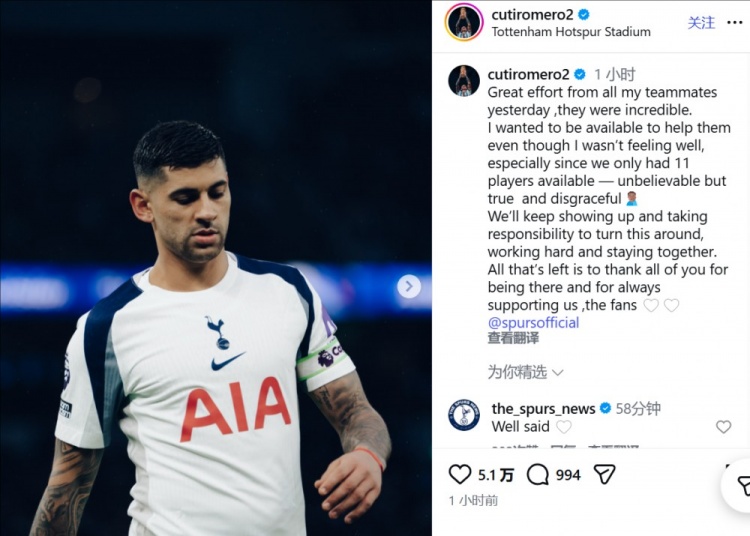 直播吧2月3日讯 热刺在昨日2-2战平曼城,热刺后卫罗梅罗在今日更新社交媒体,发表了感想。
